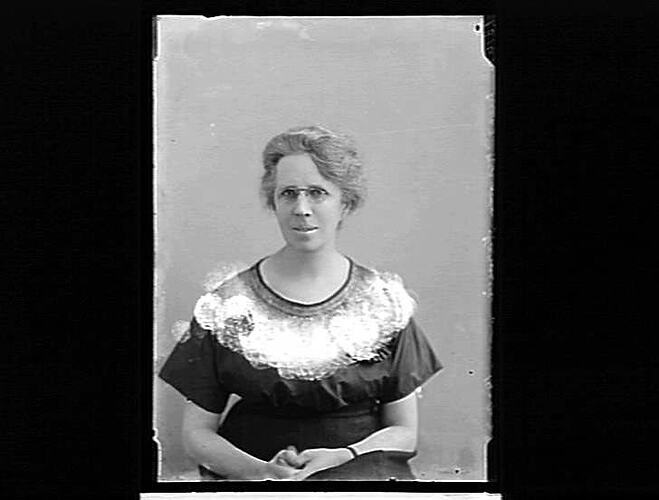 Glass plate negative portrait of Maude Jessie Harvie, possibly taken by her brother, Melbourne photographer, Robert Harvie. Maude is probably between the ages of 40 and 60.
