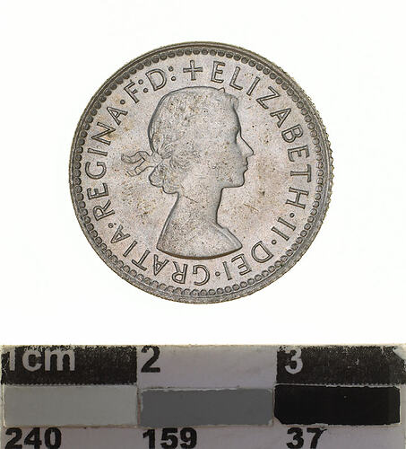 A silver coin (19 mm diameter with milled edge) featuring a laureate head of Elizabeth II facing right; around, + ELIZABETH . II . DEI . GRATIA . REGINA . F: D:. The artist's initials M.G. incuse on the bust truncation above the G of GRATIA. The reverse features the Ensigns Armorial of the Commonwealth of Australia, as authorised by Royal Warrent 7th May 1908 - composed of a simple shield enclosing a cross of Saint George on which are five six-pointed stars, around the outside of which are six small escutcheons, i.e., small shields. The shield is supported by a kangaroo and an emu standing on a grassy mound. Above the shield a crest, the seven-pointed star of Federation on a wreath. Below on a ribbon the motto ADVANCE AUSTRALIA is inscribed. Around above, SIXPENCE and below, between arrow heads, the date, 1962. 50% silver; 40% copper; 5% nickel; 5% zinc