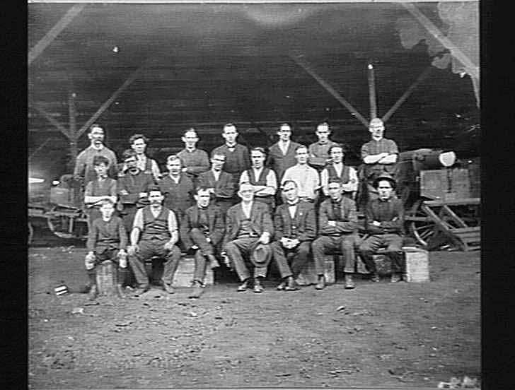 Black and white photograph of workers from the Sunshine Harvester Works' Gate Shop. Men depicted in this photograph - (Front row, left to right): Geo Bain, Fred White, Ern Nayler, Peter Richards, Vern Hocking, Charles. Pippett, Bert Grant. (Middle row, left to right): Alan Storie, Tom Moore, Bill Stavely, Peter Feney, Geo. Portwin, Peter Buckingham, Ted Silvey.