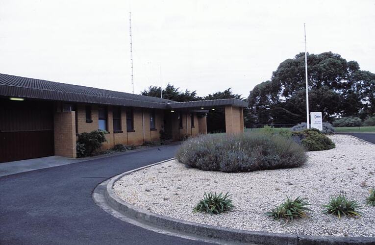 Photographic colour slide showing the front entrance and grounds, Melbourne Coastal Radio Station, Cape Schanck, Victoria.