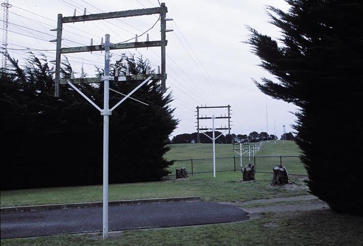 Photographic colour slide of ransmit feeder lines at the Melbourne Coastal Radio Station, Cape Schanck, Victoria.
