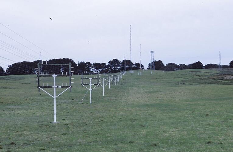 Photographic colour slide of transmit feeder lines, with the antenna for medium frequency morse transmitter in the background, at the Melbourne Coastal Radio Station, Cape Schanck, Victoria.