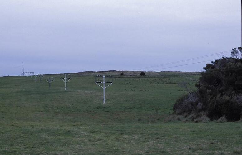 Photographic colour slide of receive feeder lines, with receive antenna in background, at the Melbourne Coastal Radio Station, Cape Schanck, Victoria.