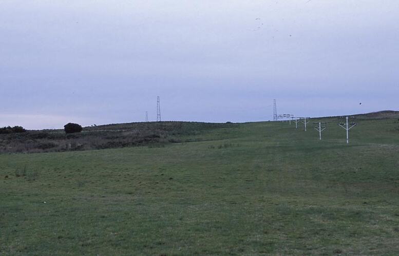 Photographic colour slide of receive antenna farm and receive feeder lines at the Melbourne Coastal Radio Station, Cape Schanck, Victoria.