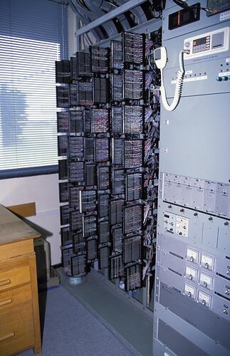 Photographic colour slide of communications equipment, Melbourne Coastal Radio Station, Cape Schanck, Victoria. Main distribution frame at left. The cabinet on the right contains, from top to bottom, the VHF test transmitter, amplifier feed to loudspeakers, transmitter patch panel, audio amplifiers for each transmitter, MF and HF emergency transmitter alarms, and 24-volt power supplies.