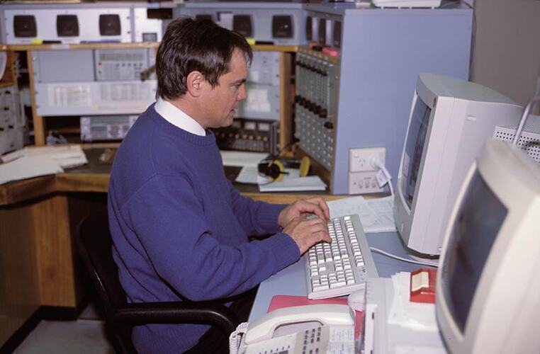 Radio operator at console. Melbourne Coastal Radio Station, Cape Schanck, Victoria