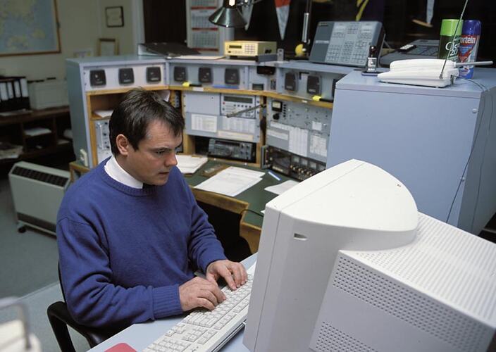 Radio operator at console. Melbourne Coastal Radio Station, Cape Schanck, Victoria