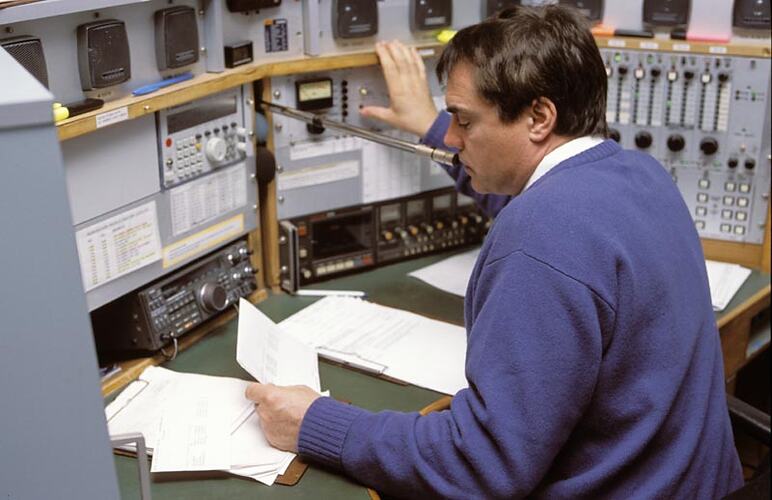 Radio operator at console. Melbourne Coastal Radio Station, Cape Schanck, Victoria