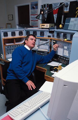 Radio operator at console. Melbourne Coastal Radio Station, Cape Schanck, Victoria