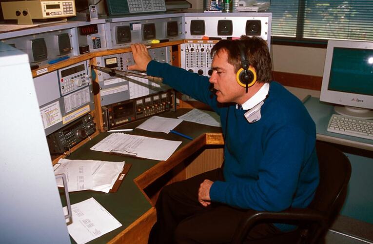 Radio operator with headphones, at console. Melbourne Coastal Radio Station, Cape Schanck, Victoria