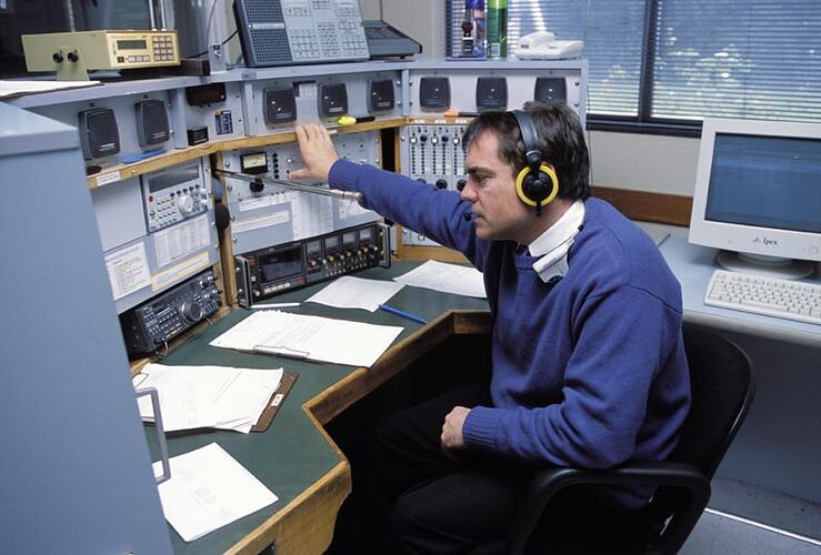 Radio operator with headphones, at console. Melbourne Coastal Radio Station, Cape Schanck, Victoria