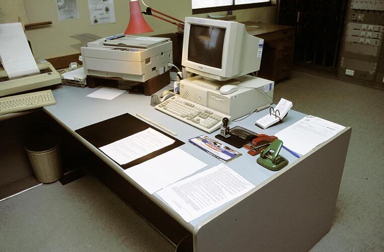 Photographic colour slide of an operator's desk, Melbourne Coastal Radio Station, Cape Schanck, Victoria. Desk holds a personal computer, a printer and other office equipment.