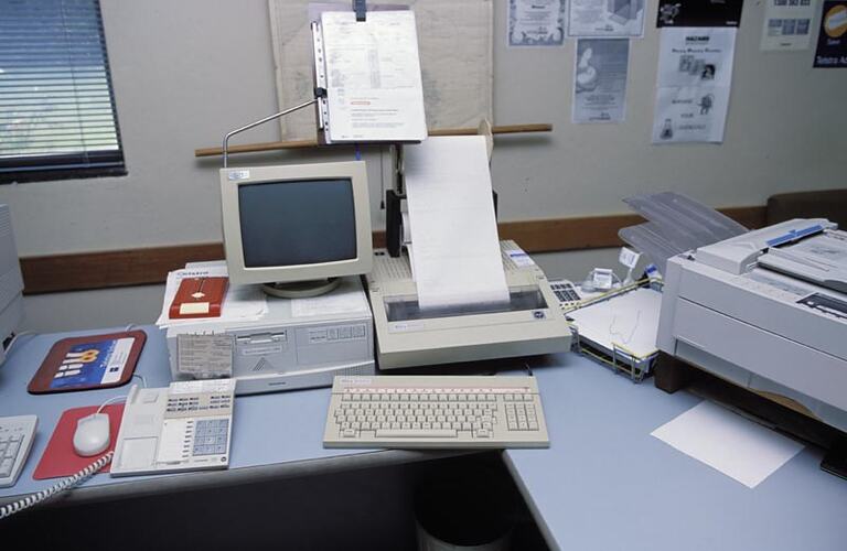 Photographic colour slide of an operator's desk, Melbourne Coastal Radio Station, Cape Schanck, Victoria. Desk holds a personal computer, a printer and other office equipment.