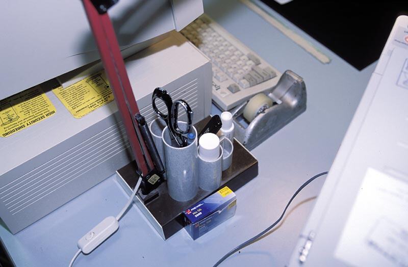 Photographic colour slide of an operator's desk, Melbourne Coastal Radio Station, Cape Schanck, Victoria. Desk holds a personal computer, a printer and other office equipment.