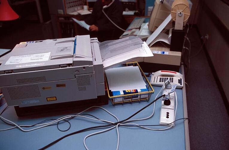 Photographic colour slide of an operator's desk, Melbourne Coastal Radio Station, Cape Schanck, Victoria. Desk holds a personal computer, a printer and other office equipment.