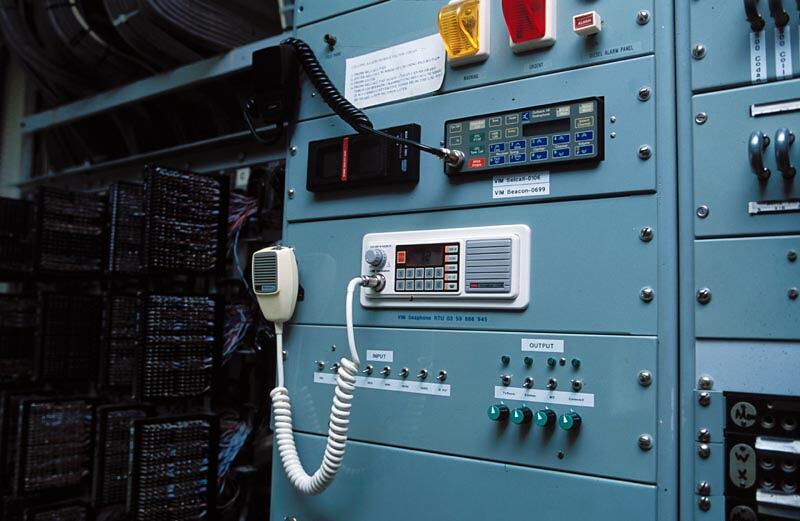 Main distribution frame on left.The cabinet on the right contains, from top to bottom, diesel generator controls, [unknown], VHF test transmitter, and amplifier feed to loudspeakers. Melbourne Coastal Radio Station, Cape Schanck, Victoria