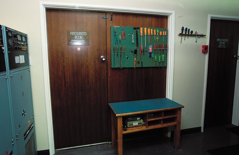 Photographic colour slide of wall-mounted tool racks, Melbourne Coastal Radio Station, Cape Schanck, Victoria.