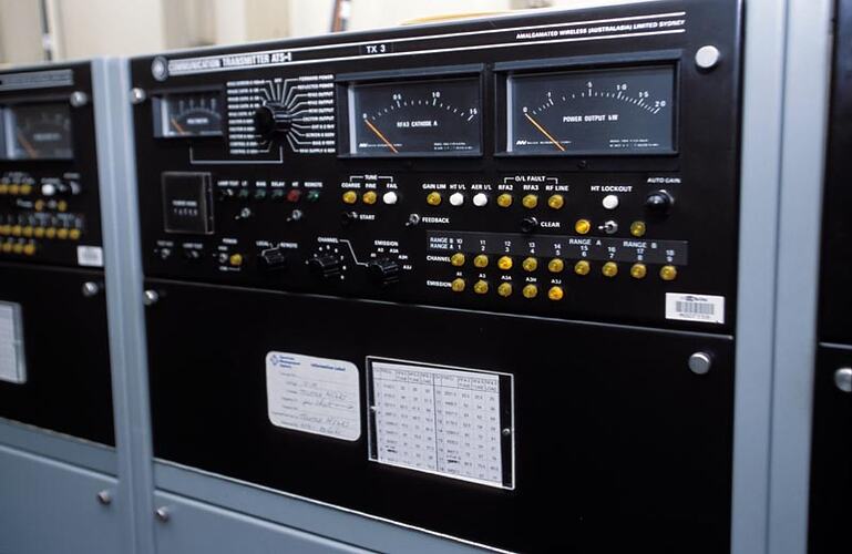Photographic colour slide of the transmitter monitor and interface for the Amalgamated Wireless (Australasia) ATS-1 transmitter, Melbourne Coastal Radio Station, Cape Schanck, Victoria.