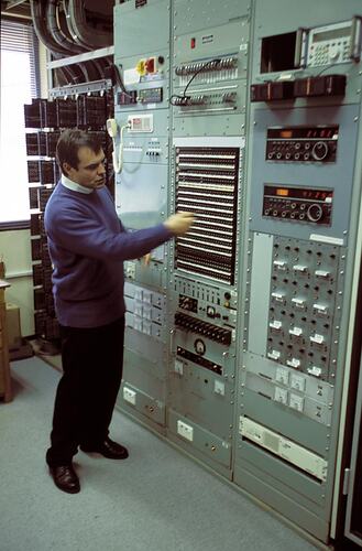 Photographic colour slide showing Mike Greenwood with radio equipment cabinets, Melbourne Coastal Radio Station, Cape Schanck, Victoria.