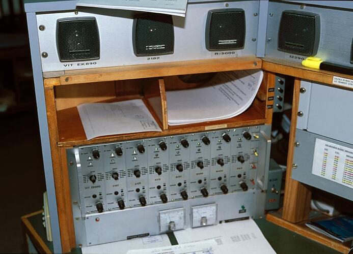 Photographic colour slide of the receiver console for distress frequencies, Melbourne Coastal Radio Station, Cape Schanck, Victoria.