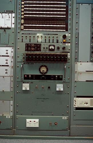 Photographic colour slide showing radio equipment in cabinets, Melbourne Coastal Radio Station, Cape Schanck, Victoria.