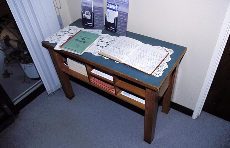 Entrance lobby table, with visitors' book. Melbourne Coastal Radio Station, Cape Schanck, Victoria