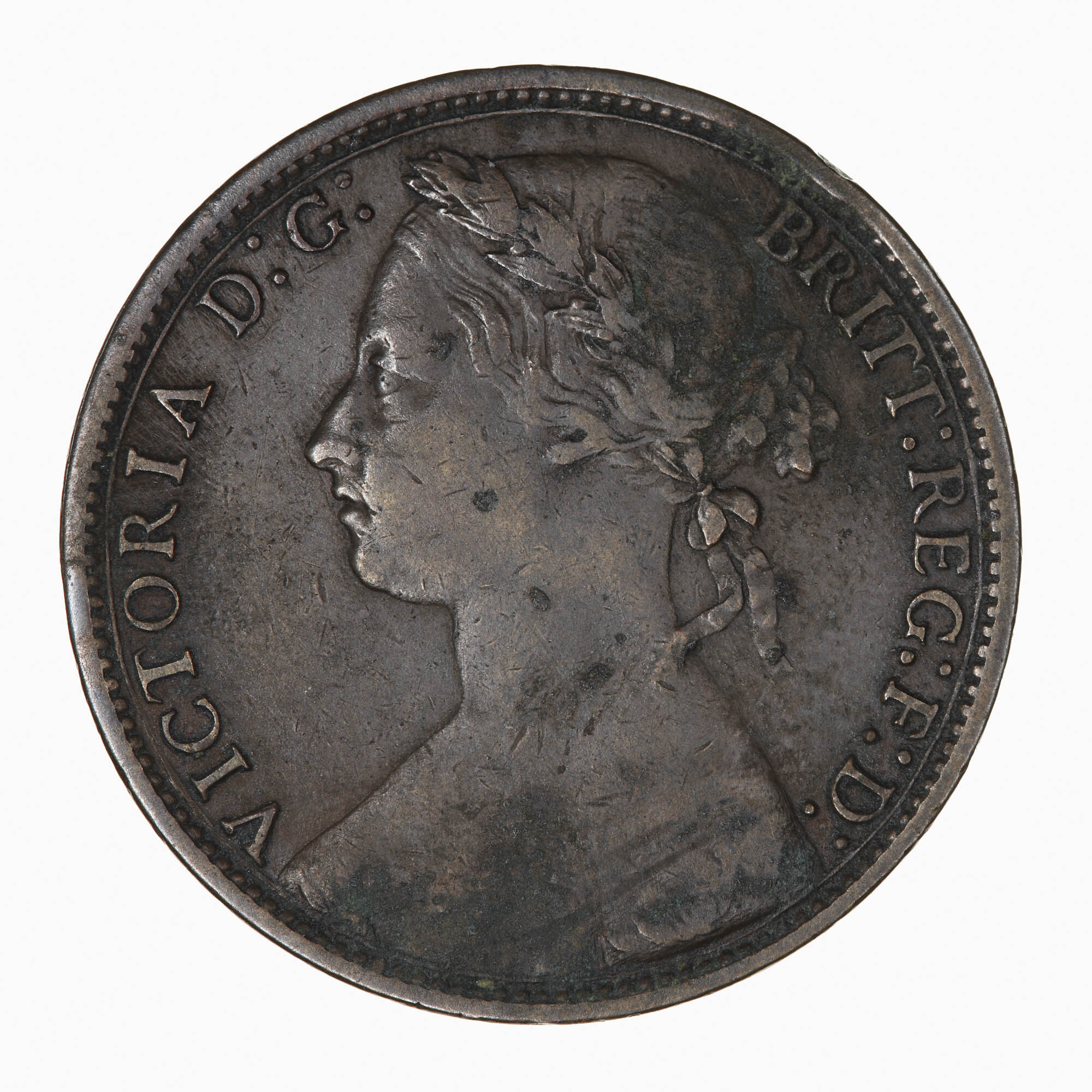 Bust of Queen Victoria facing left wearing bodice and a mantle decorated with rose, thistle and shamrock; in her hair a wreath of leaves and berries tied at back with ribbon, her hair drawn to a plaited bun behind, she wears a circular broach; around, VICTORIA D: G: BRITT: REG: F: D: