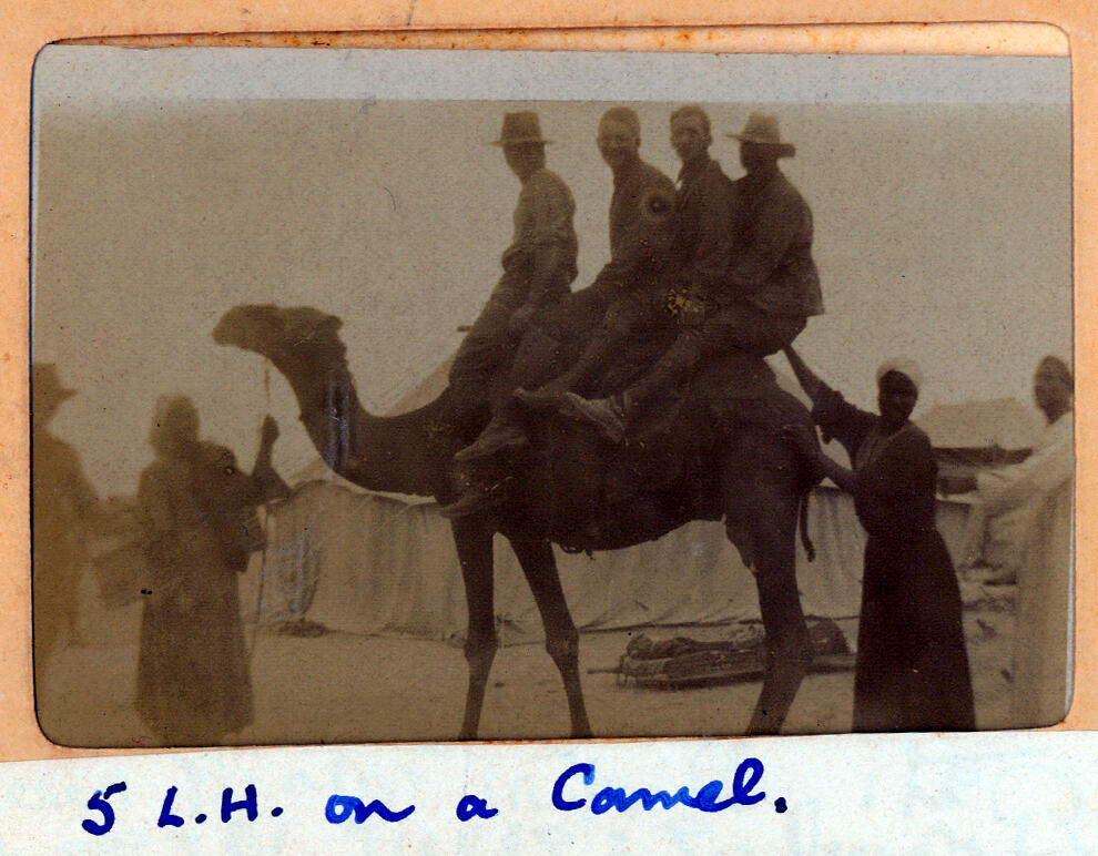 Australian servicemen, 5th. Australian Light Horse, in Egypt, 1915. Caption reads "5 L. H. on a camel". Photo of four servicemen on the back of a camel. The camel is being held at the front by an Egyptian man, while the soldier on the back of the camel is being propped up by another Egyptian with another looking on. A large white tent stands in the background. Taken by Tpr (later Lt.) G. S. Millar.