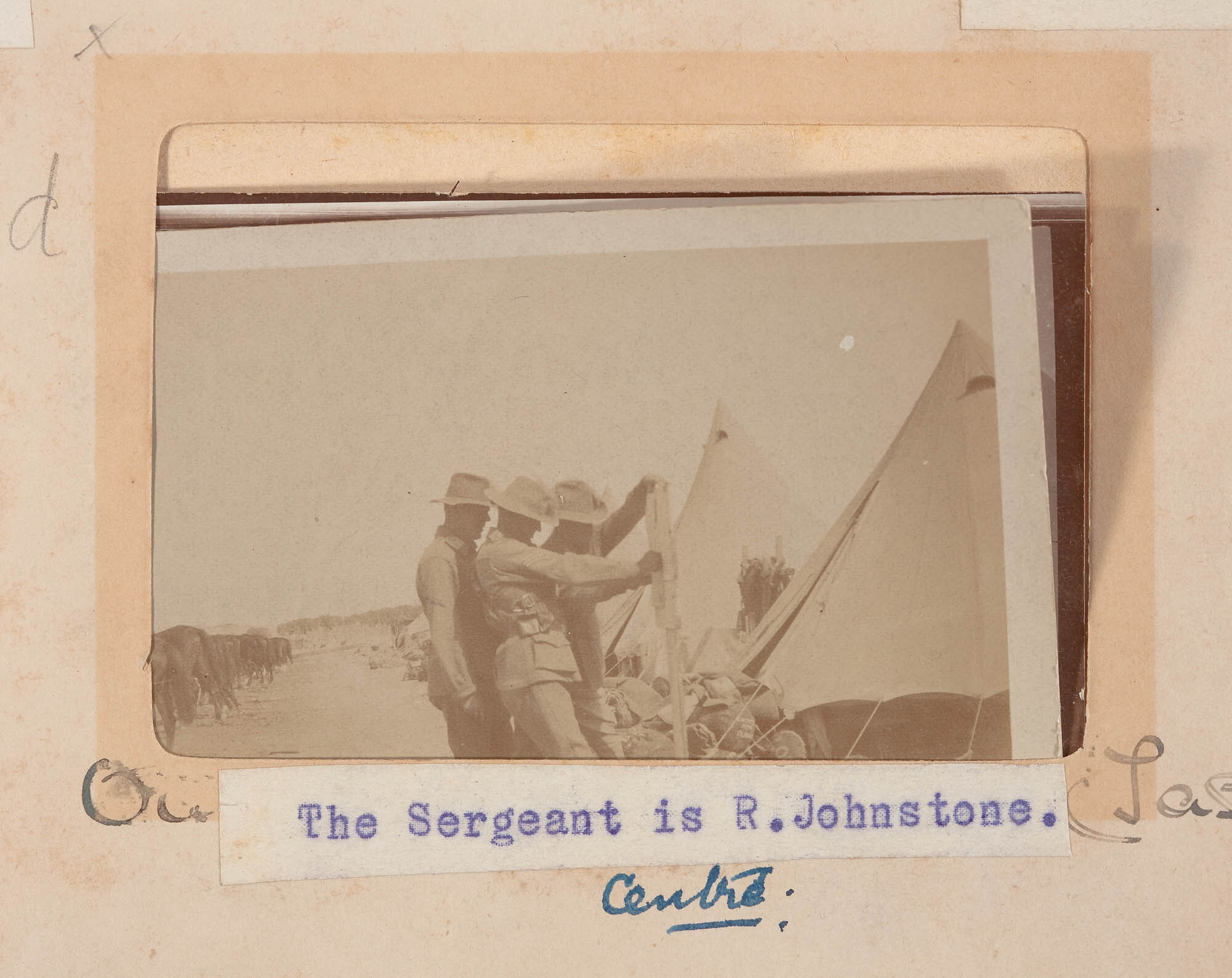 Image depicting three servicemen, one of whom is a Sergeant Johnstone, examining something within the army camp. Acting Sergeant Robert Leonard Wilcox Johnstone enlisted on October 1, 1914 and was assigned to the 5th Light Horse Regiment, C Squadron. Sergeant Johnstone was promoted to Lieutenant on October 28, 1915. He was wounded in November 1915 and, following a further wounding and illness, returned to Australia on February 21, 1916 after being declared medically unfit for duty.