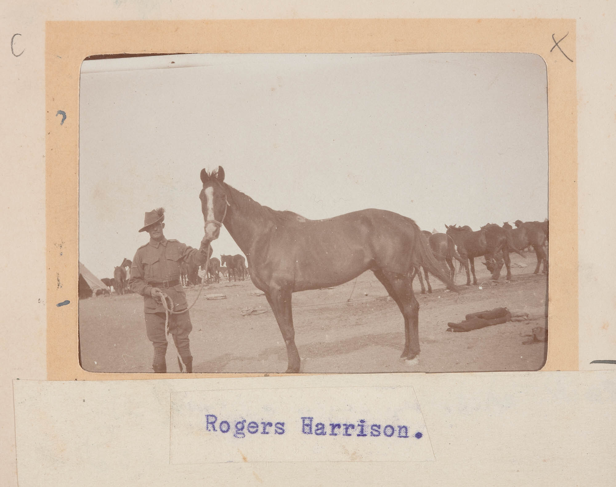 Image depicting a serviceman identified as 'Rogers Harrison' standing, facing the camera and hold the lead rope of an untacked horse that is orientated towards the left of frame but looking at the camera. Behind him is a group of tethered horses inside the camp horses were tethered with head and heel ropes between longer ropes known as picket lines.