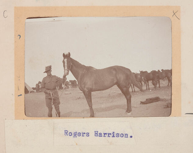Trooper Kenneth Berkley Rogers-Harrison enlisted on October 3, 1914 and was assigned to the 5th Light Horse Regiment, C Squadron. He returned to Australia in November 1918 as a Sergeant assigned to the 2nd Light Horse Regiment.