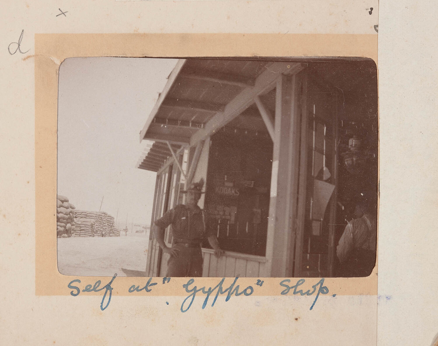 Hand-written in pencil on the support next to the left corner of the photograph: 'd' Hand-written in pencil on the support above the left corner of the photograph: 'x' Hand-written in blue ink on the support underneath the photograph: 'Self at "Gyppo" Shop.'