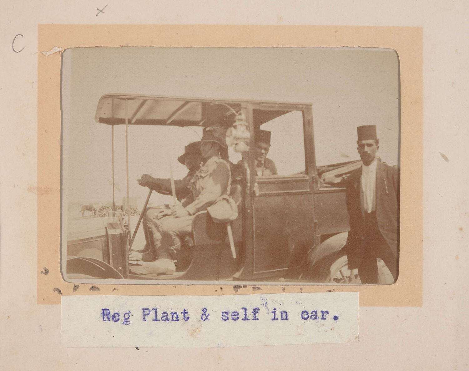 Hand-written in pencil on the support next to the top left corner: 'c' Hand-written in pencil on the support above the top left corner: 'x' Typed in blue ink underneath the photograph: 'Reg. Plant & self in car.'