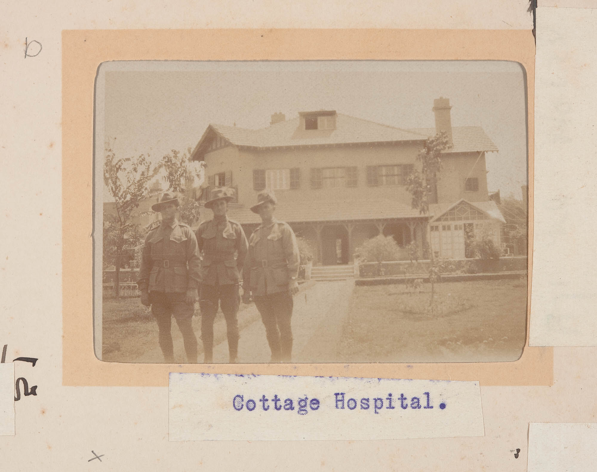 Image depicting three servicemen standing and facing the camera in front of the cottage hospital.