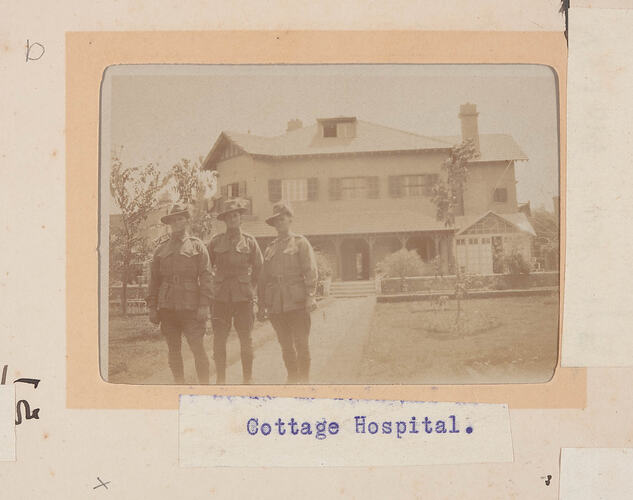 Hand-written in pencil on the support next to the top left corner of the photograph: 'b' Hand-written in pencil on the support underneath the photograph: 'x' Typed in blue ink on the support underneath the photograph: 'Cottage Hospital.'