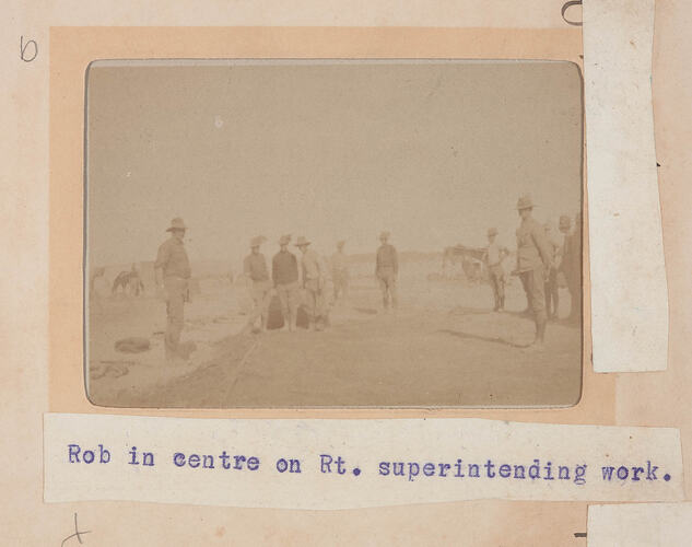 Hand-written in pencil on the support next to the top left corner of the photograph: 'b' Hand-written in pencil on the support underneath the photograph: 'x' Typed in blue ink on the support underneath the photograph: 'Rob in centre on Rt. superintending work.'