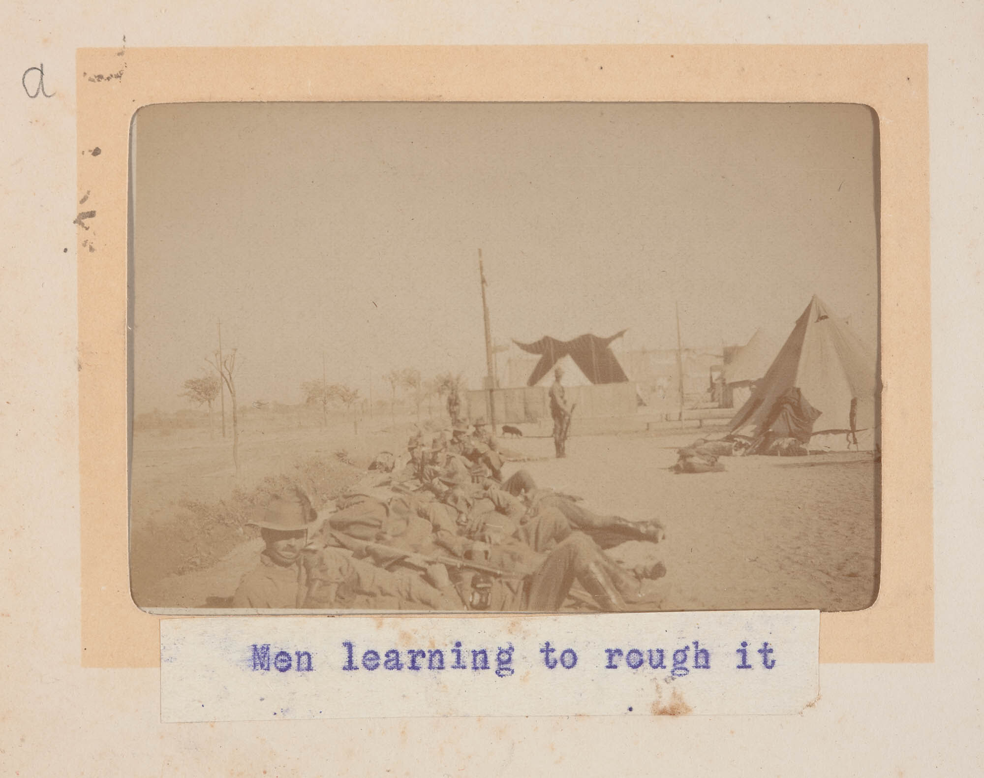 Hand-written in pencil on the support next to the top left corner of the photograph: 'a' Typed in blue ink on the support underneath the photograph: 'Men learning to rough it'