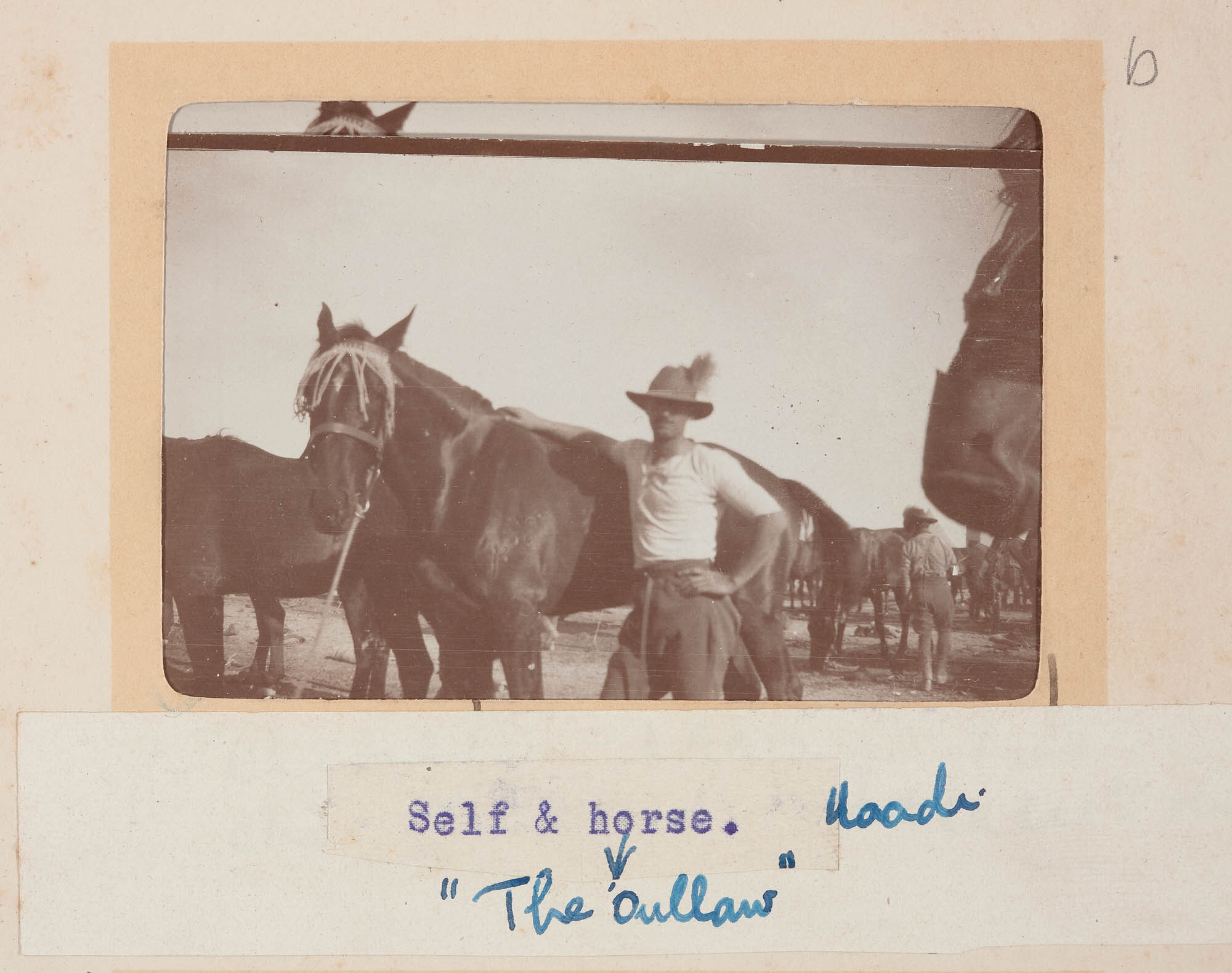 Hand-written in pencil on the support next to the top right corner: 'b' Typed in blue ink on the support underneath the photograph: 'Self & Horse' Hand-written in blue ink on the support underneath the photograph and continuing the typed inscription: 'Maadi' Hand-written in blue ink on the support underneath the photograph and the typed inscription: '(arrow pointing downwards from the word 'horse') "The Outlaw"'