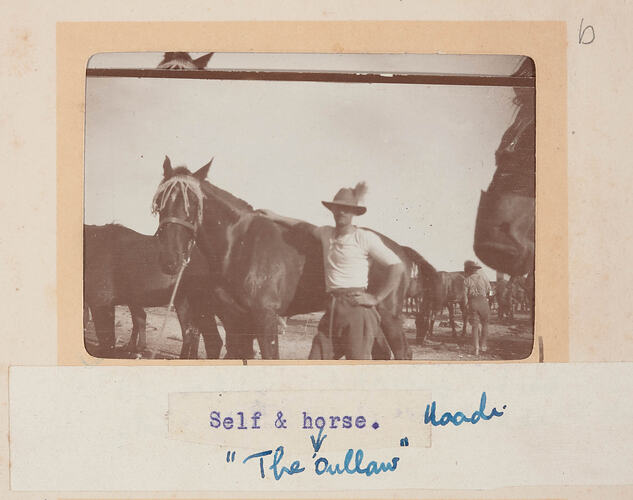 Image depicting Trooper G.S. Millar and his horse "The Outlaw" at Maadi camp. The Outlaw was a remount cast off. Remounts (commonly called "Walers" because of their origins in New South Wales) were horses bought by the Commonwealth from graziers and breeders. Many of these horses did not have names and it is therefore likely that it was Trooper Millar who gave his horse the name "The Outlaw." The men spent much of their spare time looking after their horses which strengthened the bond between the men and their mounts.