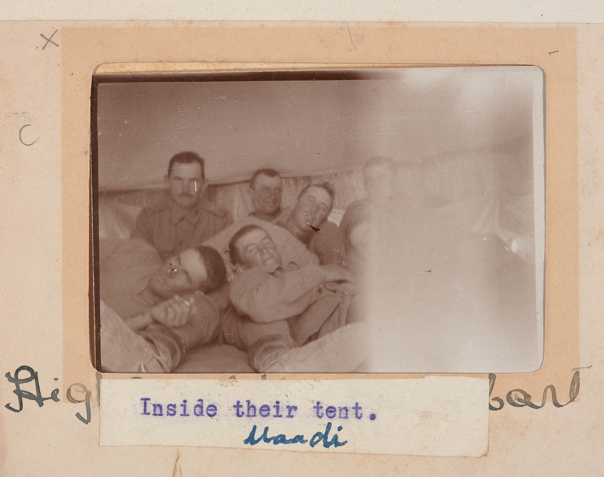 Hand-written in ink on the support on the left side of the photograph: 'x / c' Hand-written in black ink on the support underneath the photograph and partially obscured by a typed inscription: 'Fligh(obscured) (illegible)' Typed in blue ink on the support underneath the photograph: 'Inside their tent.' Hand-written in blue ink on the support underneath the photograph and the typed inscription: 'Maadi'