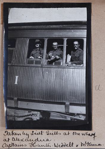 According to the inscription this image was taken by Lieutenant Grills depicting Captains Hunter, Weddell and McKenna on board what looks be a train at the Alexandria Wharf. Captain Herbert Humphrey Hunter was assigned to the 7th Battalion G Company. He was killed in action in May 1915 at Gallipoli. Lieutenant Robert Hunter Weddell was assigned to the 7th Battalion F Company. He returned to Australia as Major Weddell in February 1916. Captain Edward Albert McKenna is believed to have been the main photographer of the album and was assigned to the 7th Battlion E Corp. He was killed in action at the Gallipoli landing.