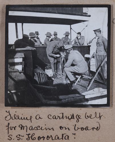 Hand-written in pencil on the bottom right corner of the photograph album page: '1' Hand-written in ink on the support underneath the photograph: 'Filling a cartridge belt / for Maxim on board / S.S. "Hororata."' Hand-written in pencil on the support top right corner: 'c' Hand-written in pencil on the back of the photograph: 'Filling one cartridge / belt for Maxim Gun / on S.S. Hororato'