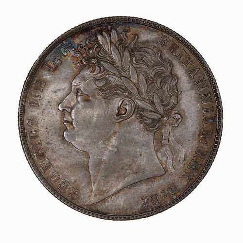 Laureate head of the King facing left; below in small lettering the artist's initials, B.P. (Benedetto Pistrucci); around, GEORGIUS IIII D: G: BRITANNIAR: REX F:D: