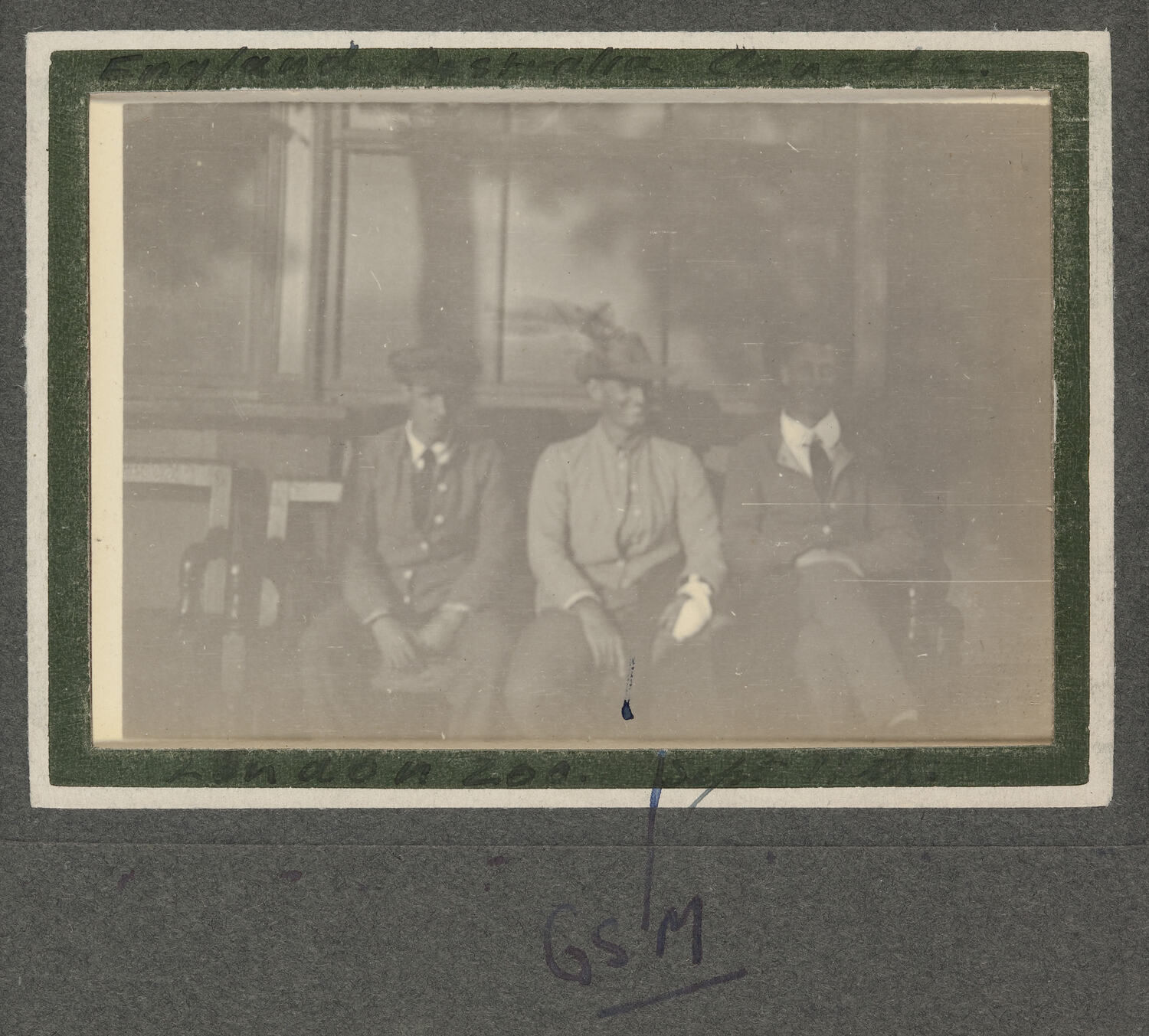 Hand written on secondary support above image: 'England Australia Canada' Hand written on secondary support below image: 'London Zoo Sept 11th\GSM' Bottom left corner of album page, handwritten in pencil: '19'