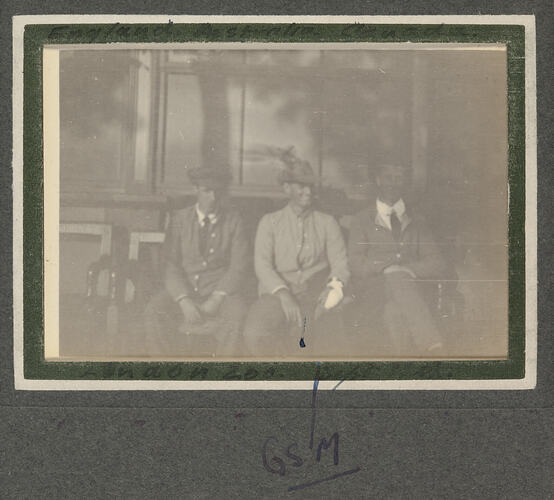 Photograph of three men sitting on an bench at the London Zoo. The soldiers appear to be wearing hospital uniforms, the person on the left is possibly wearing an peaked general service cap, the person in the centre, identified as George Simpson Millar, is wearing an Australian slouch hat with an light horseman plume and he has an bandaged hand. The person on the right is also wearing an hat, but it is placed too far back on his head to be identifiable.