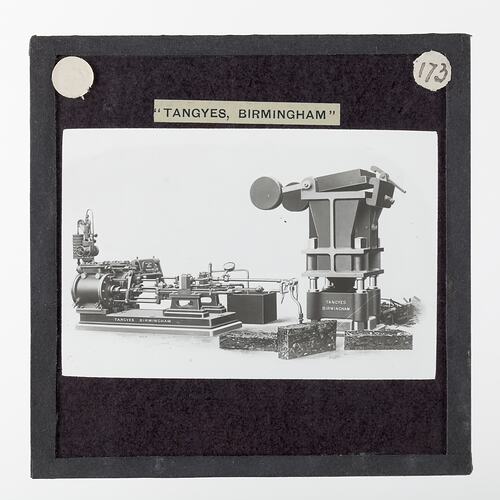 One of 239 glass lantern slides depicting products manufactured by Tangyes Limited engineers of Birmingham, England. The images include various products such as engines, centrifugal pumps, hydraulic pumps, gas producers, materials testing machines, presses, machine tools, hydraulic jacks etc. Tangyes was a company which operated from 1857 to 1957. They produced a wide variety of engineering products exported worldwide including Australia and other British colonies.