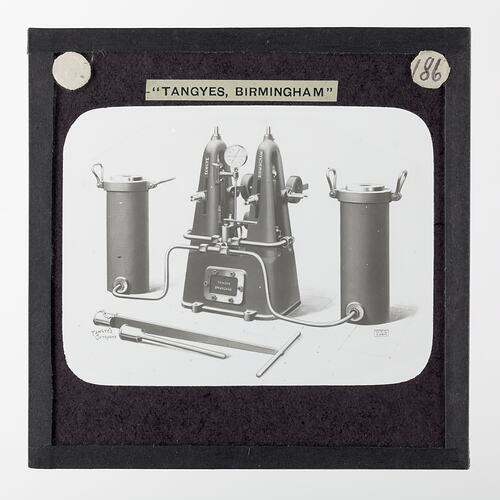 One of 239 glass lantern slides depicting products manufactured by Tangyes Limited engineers of Birmingham, England. The images include various products such as engines, centrifugal pumps, hydraulic pumps, gas producers, materials testing machines, presses, machine tools, hydraulic jacks etc. Tangyes was a company which operated from 1857 to 1957. They produced a wide variety of engineering products exported worldwide including Australia and other British colonies.