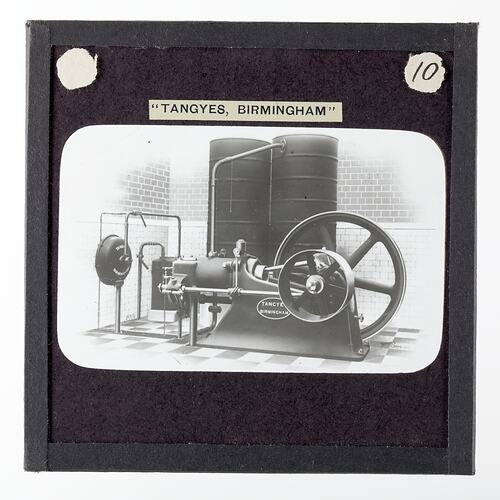 One of 239 glass lantern slides depicting products manufactured by Tangyes Limited engineers of Birmingham, England. The images include various products such as engines, centrifugal pumps, hydraulic pumps, gas producers, materials testing machines, presses, machine tools, hydraulic jacks etc. Tangyes was a company which operated from 1857 to 1957. They produced a wide variety of engineering products exported worldwide including Australia and other British colonies.