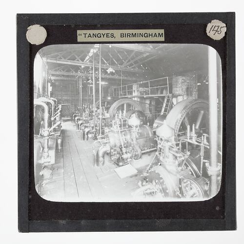 One of 239 glass lantern slides depicting products manufactured by Tangyes Limited engineers of Birmingham, England. The images include various products such as engines, centrifugal pumps, hydraulic pumps, gas producers, materials testing machines, presses, machine tools, hydraulic jacks etc. Tangyes was a company which operated from 1857 to 1957. They produced a wide variety of engineering products exported worldwide including Australia and other British colonies.