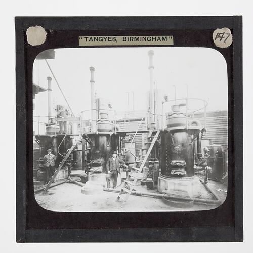 One of 239 glass lantern slides depicting products manufactured by Tangyes Limited engineers of Birmingham, England. The images include various products such as engines, centrifugal pumps, hydraulic pumps, gas producers, materials testing machines, presses, machine tools, hydraulic jacks etc. Tangyes was a company which operated from 1857 to 1957. They produced a wide variety of engineering products exported worldwide including Australia and other British colonies.